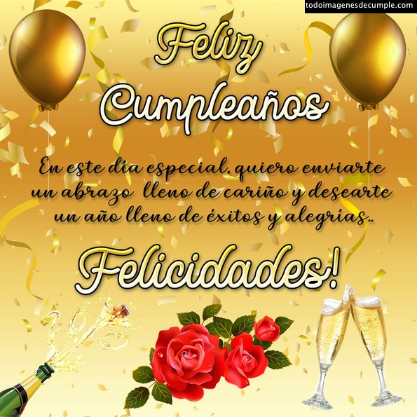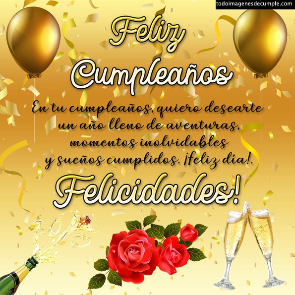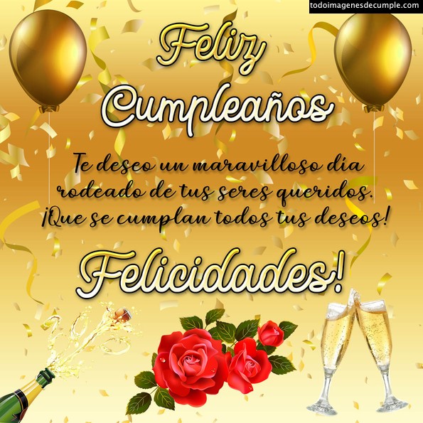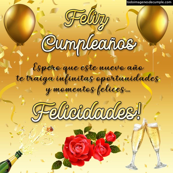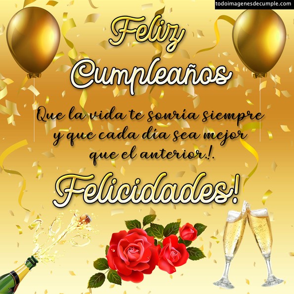 Nuevos modelos de imágenes de cumpleaños gratis con frases se asoman! te traemos esta novedad exclusiva de Todo Imágenes de Cumple, con un diseño en dorado increíble! el cual le da un toque de glamour, delicadeza y alegría. Te invitamos a ver todos los modelos más abajo. El diseño tiene globos, copas de champagne, una botella y rosas en color rojo, las cuales destacan exquisitamente en un contraste con dorado increíble.