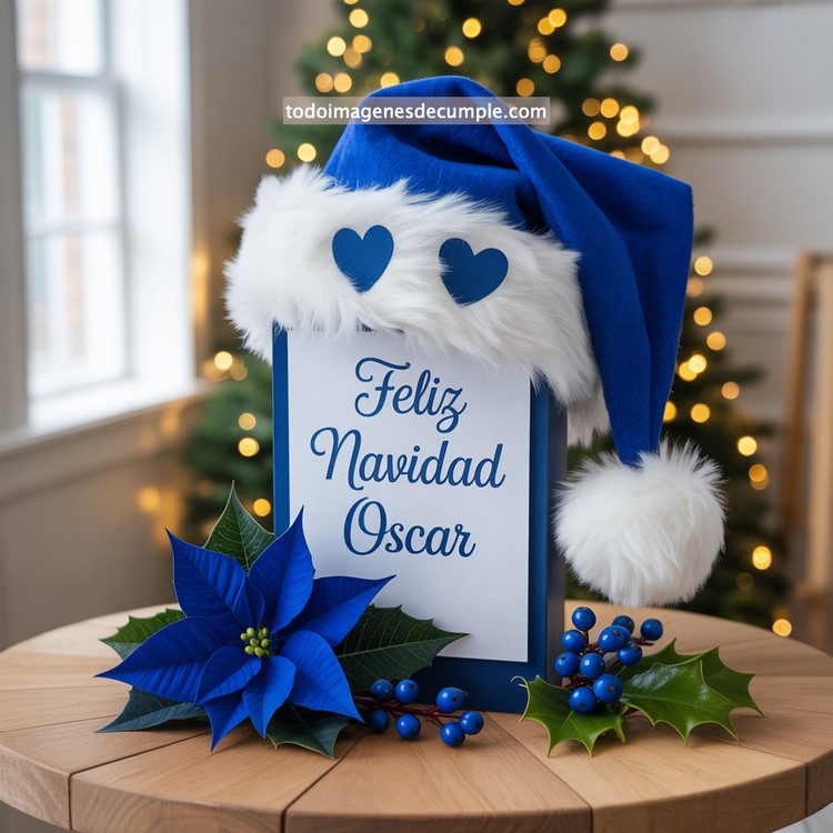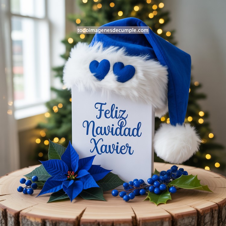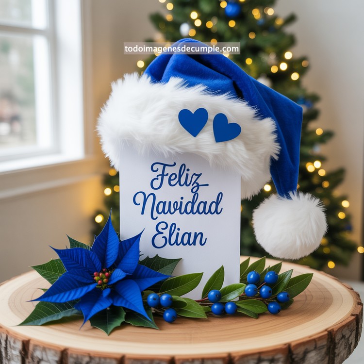 La temporada navideña trae consigo momentos llenos de magia, detalles especiales y deseos que llegan al corazón. Por eso, hoy queremos presentarte una colección única de imágenes de Feliz Navidad con nombre de hombre, creadas con un diseño encantador que combina tradición, calidez y un toque moderno. El modelo que te mostramos, y que puedes ver, refleja perfectamente ese espíritu festivo: un hermoso gorro de Santa en color azul intenso con borde blanco esponjoso, decorado con dos corazones del mismo tono que añaden suavidad y ternura. Al centro, el mensaje Feliz Navidad acompañado del nombre resalta con una tipografía elegante y armónica. La composición se completa con una flor de pascua azul y ramas decorativas que hacen que todo el diseño luzca sofisticado y festivo.