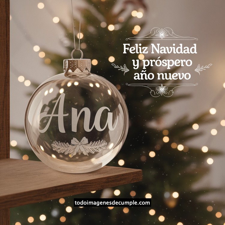 El diseño tiene como protagonista una delicada borla transparente, en cuyo interior se personaliza el nombre de la destinataria, creando un efecto único y encantador. A un costado, en una tipografía blanca legible, se encuentra la frase Feliz Navidad y próspero Año Nuevo, transmitiendo un mensaje lleno de buenos deseos y calidez.