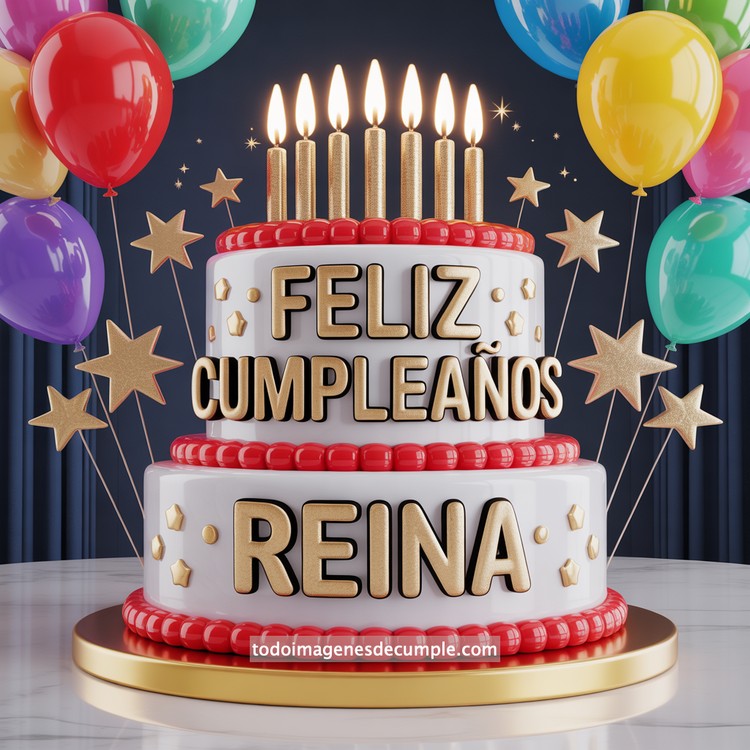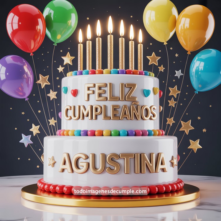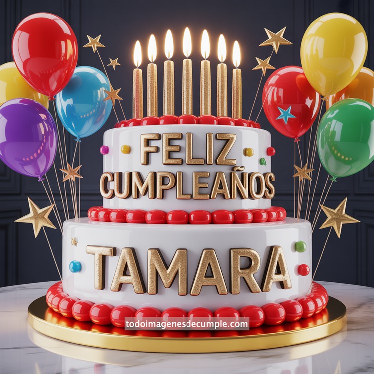 Las celebraciones especiales merecen imágenes que transmitan alegría desde el primer vistazo, y por eso hemos preparado una colección única de imágenes de cumpleaños con nombre pensada para sorprender a cualquiera. Entre ellas destaca un diseño vibrante y festivo como el que acompaña este post: un pastel de dos pisos, impecable en blanco brillante, decorado con estrellas doradas, pequeños detalles en rojo y un borde perlado que hace resaltar aún más su estilo moderno. En la parte superior se alzan velas doradas encendidas, generando un ambiente cálido y lleno de magia. Alrededor del pastel flotan globos de colores intensos —rojo, azul, verde, amarillo y violeta— que aportan un toque aún más alegre y celebratorio.
